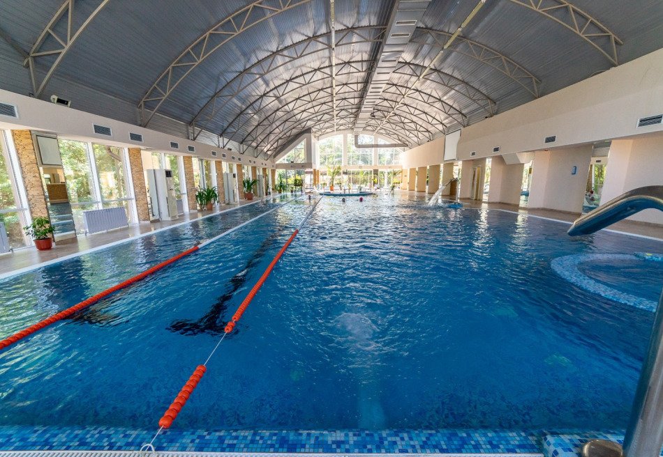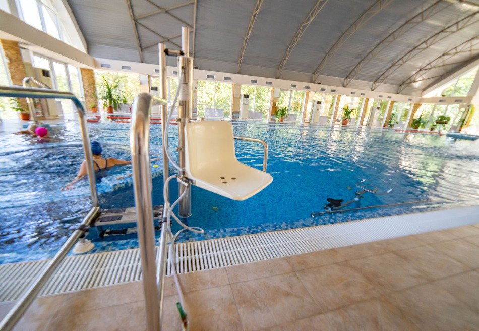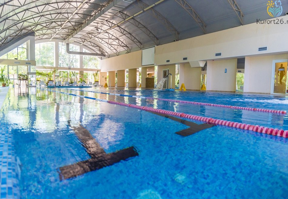 - Бассейн 25 м с двумя дорожками, гидромассажем, водопадом, противоток для активного плавания. В бассейне установлен подводный велотренажер и подъемник для спуска в воду маломобильных гостей