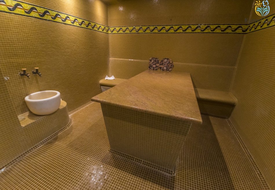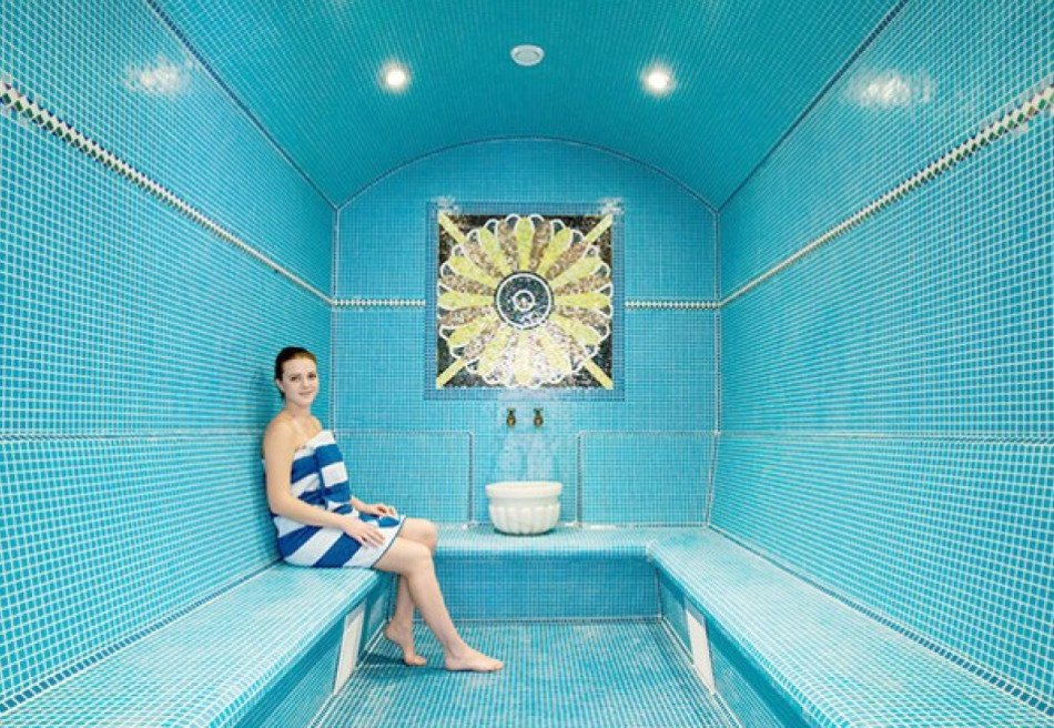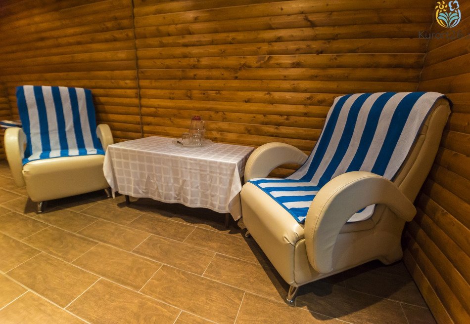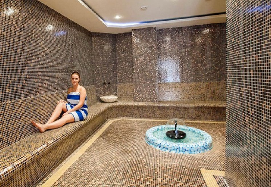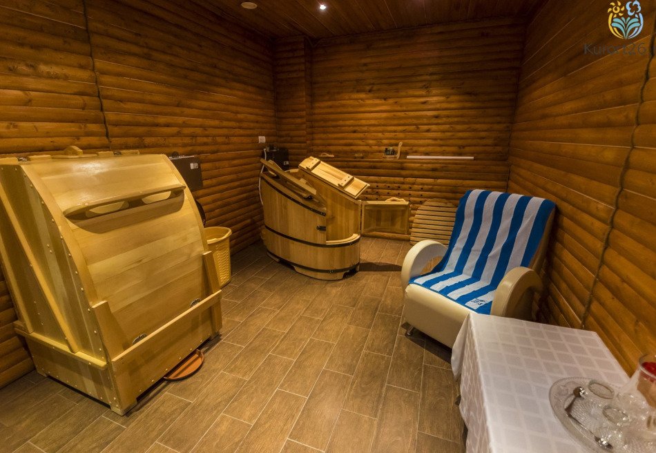 - Термальный комплекс: хаммам, сауна, римская и турецкая бани, кедровая бочка. Процедуры можно дополнить баночным и медовым массажами, мыльным пилингом шёлковой рукавицей Кесе. Посещение сауны и хаммама включено в путёвку