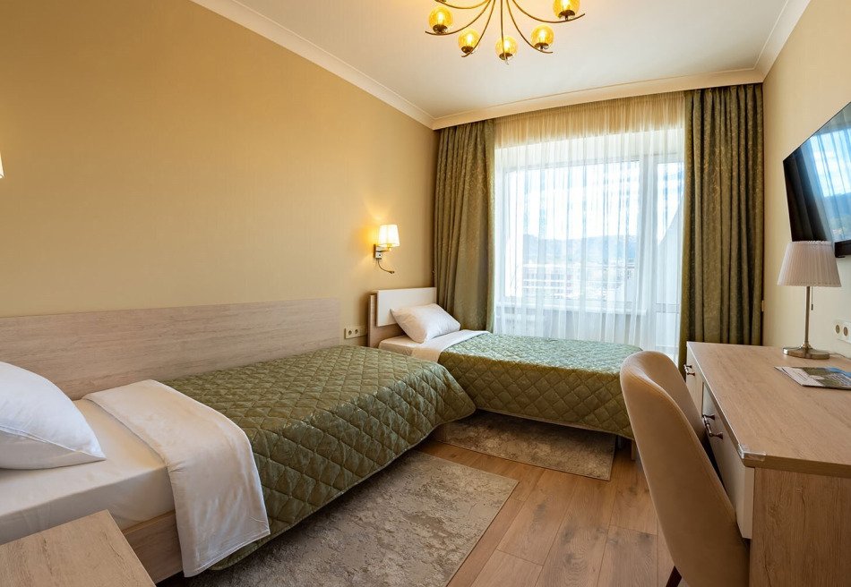 - Есть номера с балконами с ротанговой мебелью и живописным видом на Курортный парк и Кавказский хребет