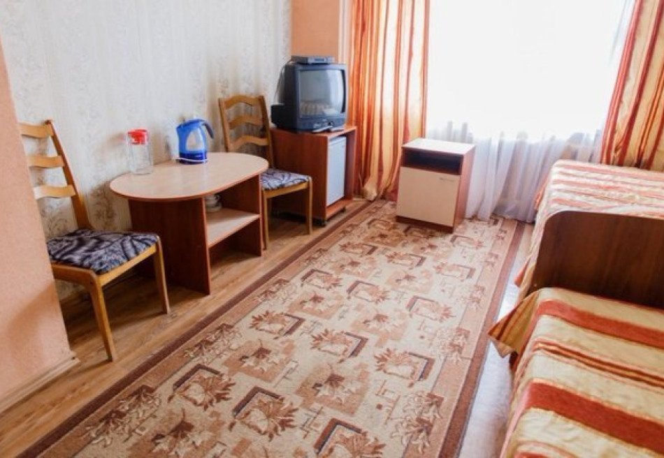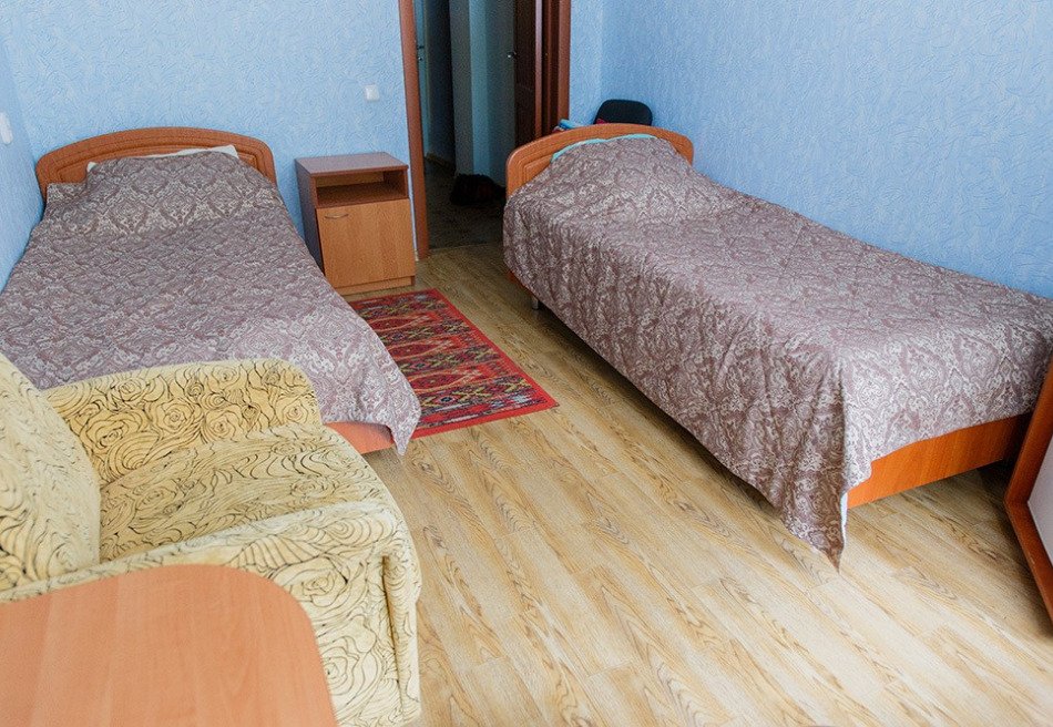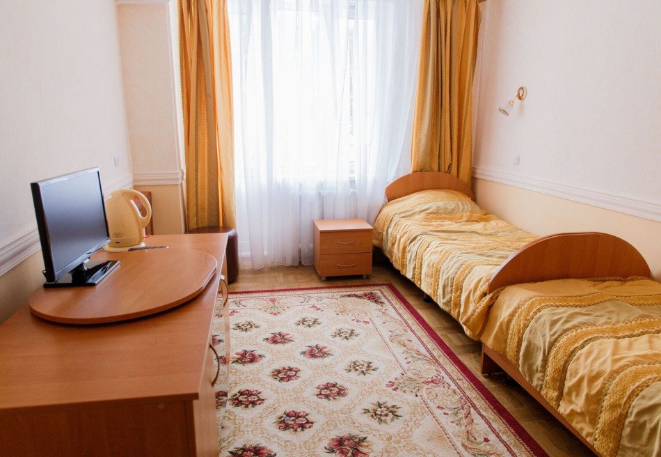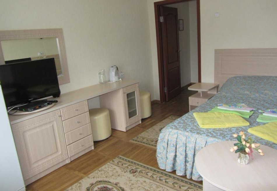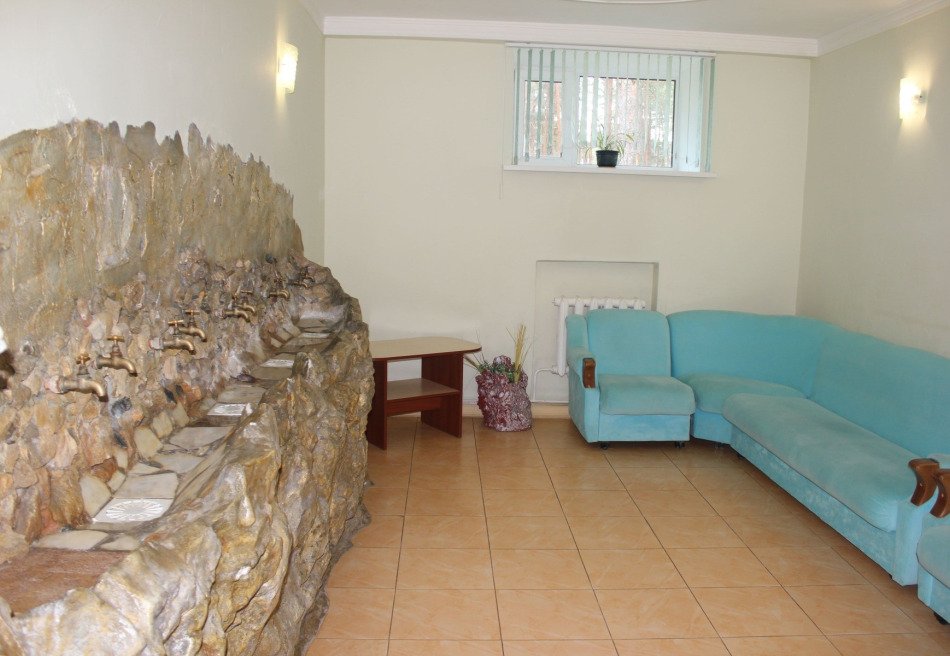 Спальный корпус имеет высоту в 8 этажей. Здесь же находятся столовая и лечебная зона. Во втором корпусе располагаются разнообразные развлечения, сухие углекислые ванны. В комнатах для гостей установлена необходимая мебель для отдыха, хранения одежды и личных вещей. К услугам гостей кондиционер, телевизор с плоским экраном, холодильник, электрический чайник. Санузел индивидуальный, с душем и туалетными принадлежностями. В санатории работает высокоскоростной интернет.