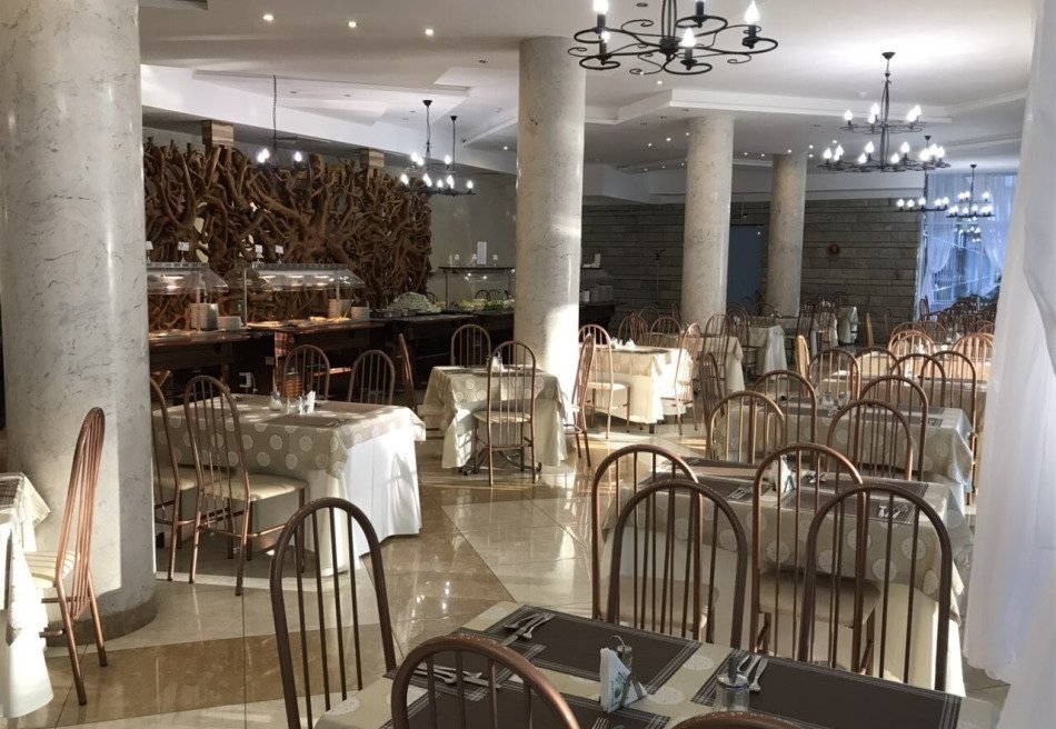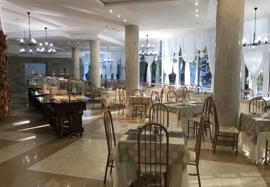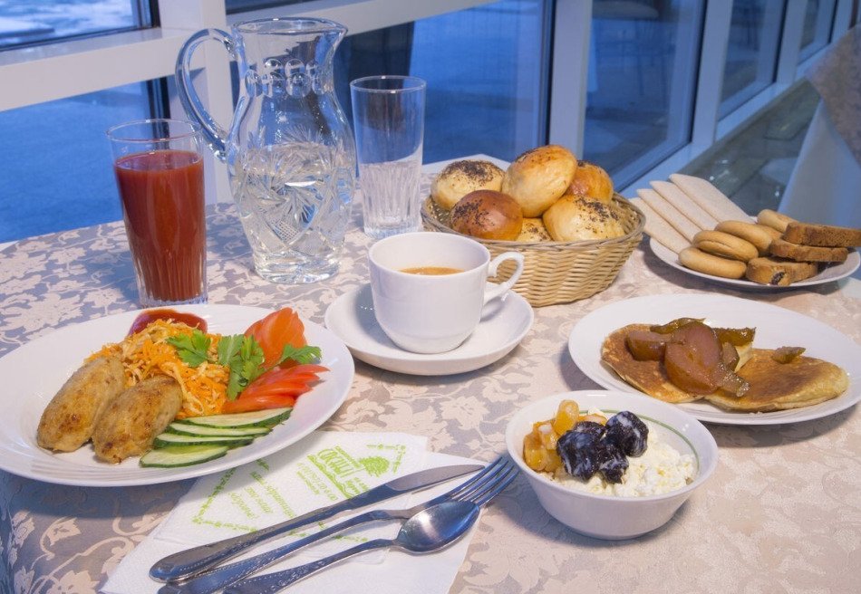 В санатории организовано трехразовое питание (шведский стол). Кроме того, при необходимости и по желанию доступно банкетное, детское и вегетарианское питание. Также работают кафе и бар.